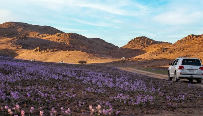 حائل کی پہاڑیوں پر جامنی پھولوں کا حسین منظر