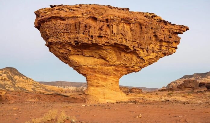 سعودی عرب کا تبوک ریجن اپنی حیرت انگیز قدرتی بناوٹوں کے باعث مشہور ہے، جہاں ایک چٹان ہزاروں سال کی ارضیاتی تبدیلیوں سے ایسی شکل اختیار کرچکی ہے کہ دیکھنے والوں کو یہ ایک بڑے ستون پر رکھی ہوئی میز محسوس ہوتی ہے۔ ہوا اور موسم کے مسلسل اثرات نے اسے منفرد قدرتی فن پارے میں بدل دیا ہے۔