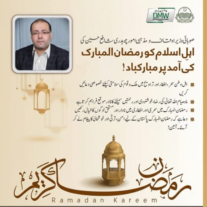 صوبائی وزیر صنعت و تجارت، اوقاف و مذہبی امور چوہدری شافع حسین نے رمضان المبارک کی آمد کے موقع پر تمام اہلِ اسلام کو دلی مبارکباد پیش کی ہے۔ اپنے پیغام میں انہوں نے کہا کہ رمضان المبارک رحمتوں، برکتوں اور عبادات کا مقدس مہینہ ہے جو ہمیں صبر، برداشت اور بھائی چارے کا درس دیتا ہے۔ انہوں نے عوام سے اپیل کی کہ اس بابرکت مہینے میں ضرورت مندوں کی مدد کریں اور معاشرے میں محبت، اتحاد اور ہم آہنگی کو فروغ دیں۔