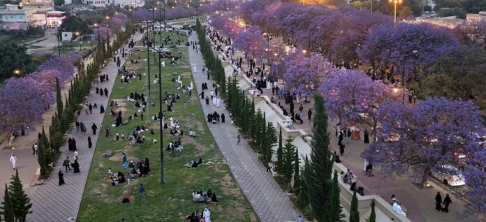 عسیر ریجن کے پہاڑی شہر ابہا میں موسم بہار اپنے عروج پر ہے جہاں جیکارانڈا کے درختوں پر کھلنے والے بنفشی پھول شہر کو دلکش منظر میں بدل رہے ہیں۔ سڑکیں، پارکس اور فٹ پاتھ پھولوں سے ڈھک کر قدرتی حسن پیش کر رہے ہیں، جس سے پورا شہر ایک خوبصورت سیاحتی مقام بن گیا ہے۔