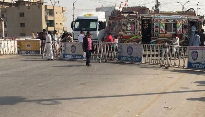 پی آئی ڈی سی چوک سے ایم ٹی خان روڈ جانے والا پل، سلطان آباد کے قریب ایم ٹی خان روڈ، اور میری ویدر ٹاور سے مولوی تمیز الدین روڈ تک مختلف مقامات پر کنٹینرز لگا کر آمد و رفت معطل کر دی گئی ہے۔ اسی طرح بوٹ بیسن سے مائی کولاچی بائی پاس اور اطراف کی سڑکوں کو بھی سیل رکھا گیا ہے۔